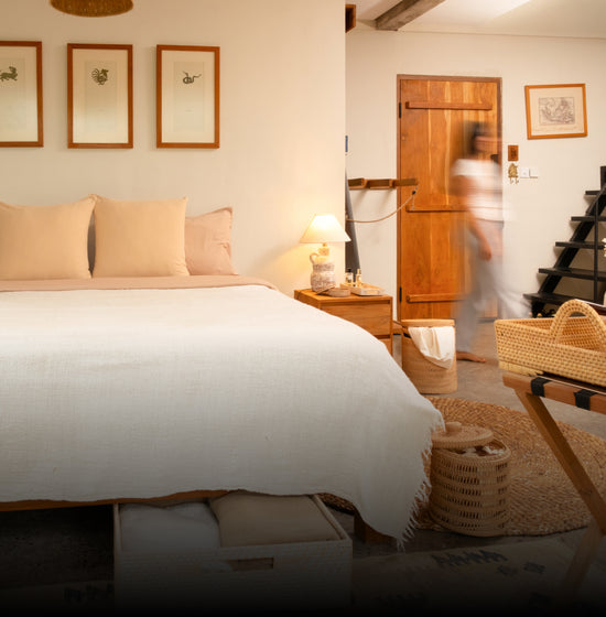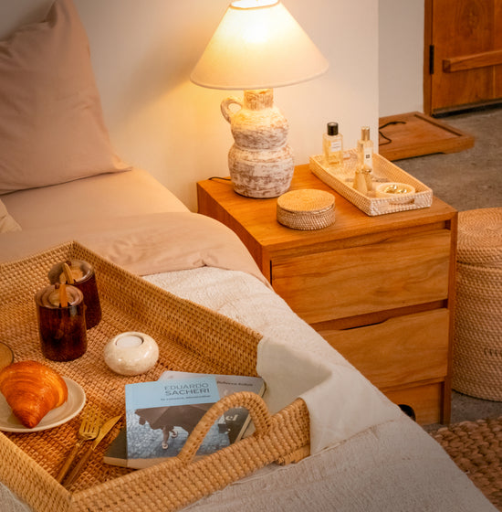 Here we are showcasing our serene bedroom styled with our handcrafted rattan and marble pieces for storage and décor. The warm, woven textures pair beautifully with wooden furniture, neutral tones and cool marble creating a natural, coastal-inspired look.