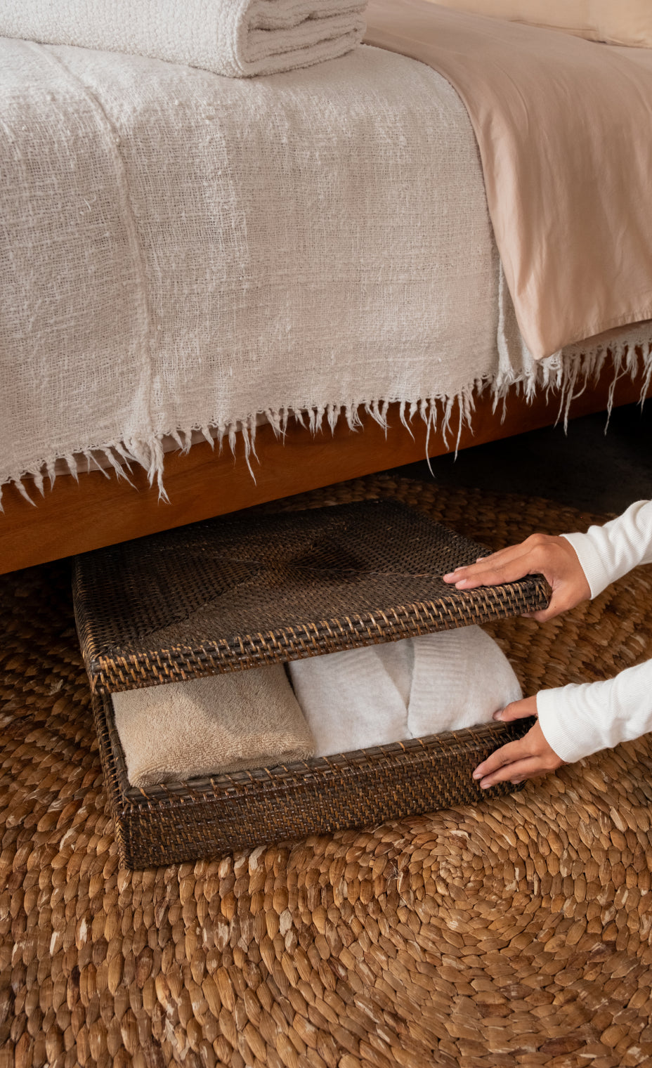 "Tuck away your seasonal linens or bulky items with our rattan under-bed storage. Pair it with breezy white bedding and add a woven rug for a cohesive coastal look."