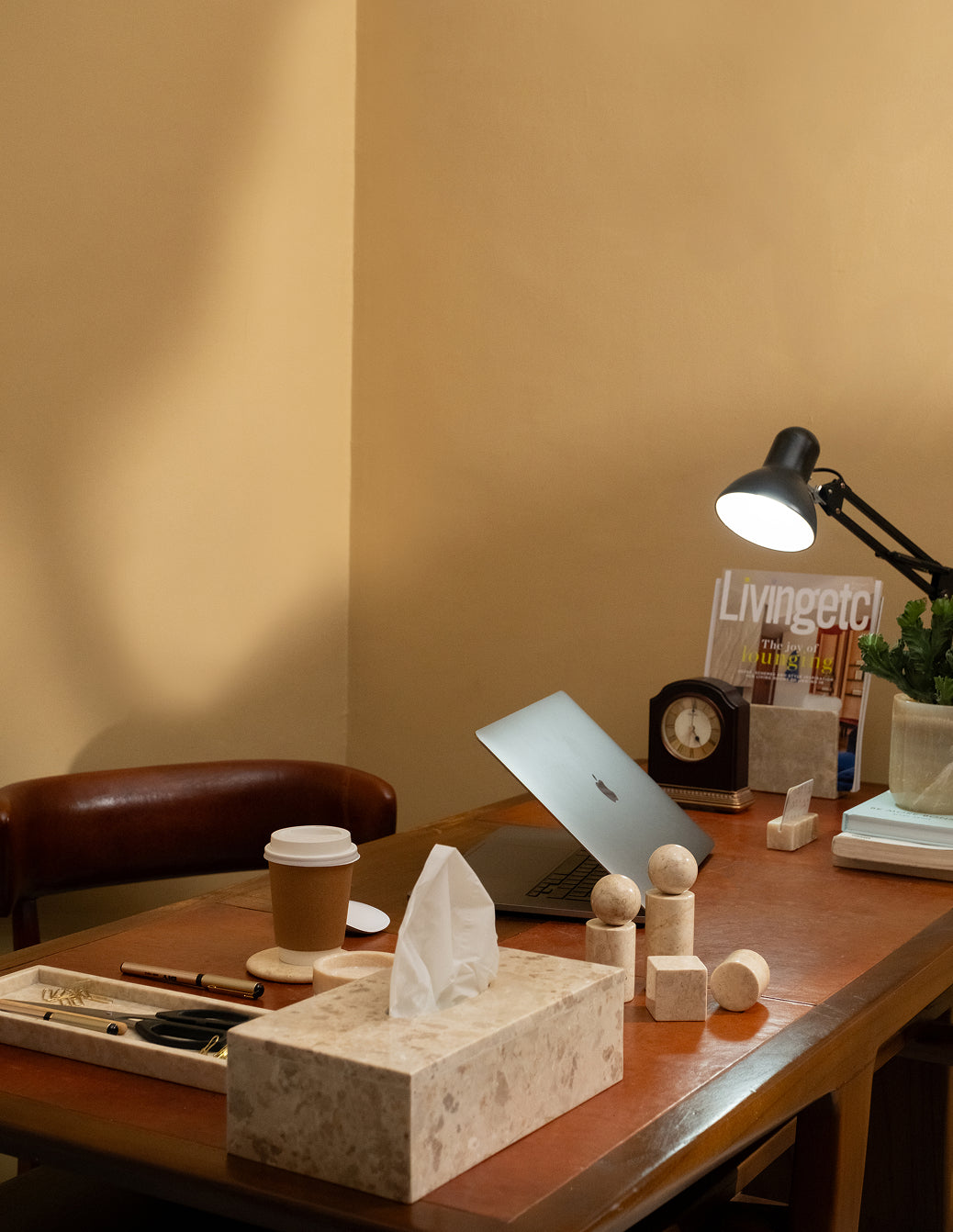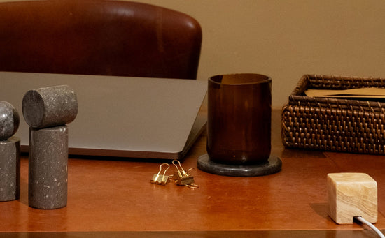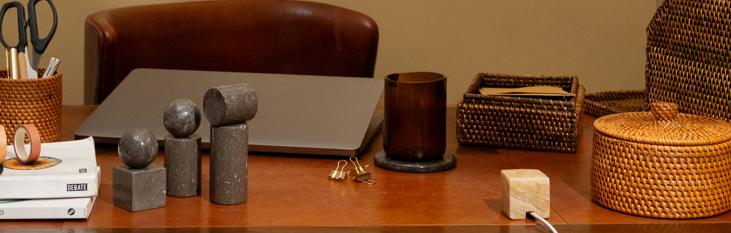 We think a workspace should feel intentional—grounded in quality, craftsmanship, and natural beauty. Say goodbye to disposable plastic and embrace pieces that stand the test of time. Hand-carved stone and woven rattan create a textured, tactile environment, designed to inspire calm, clarity, and effortless luxury.